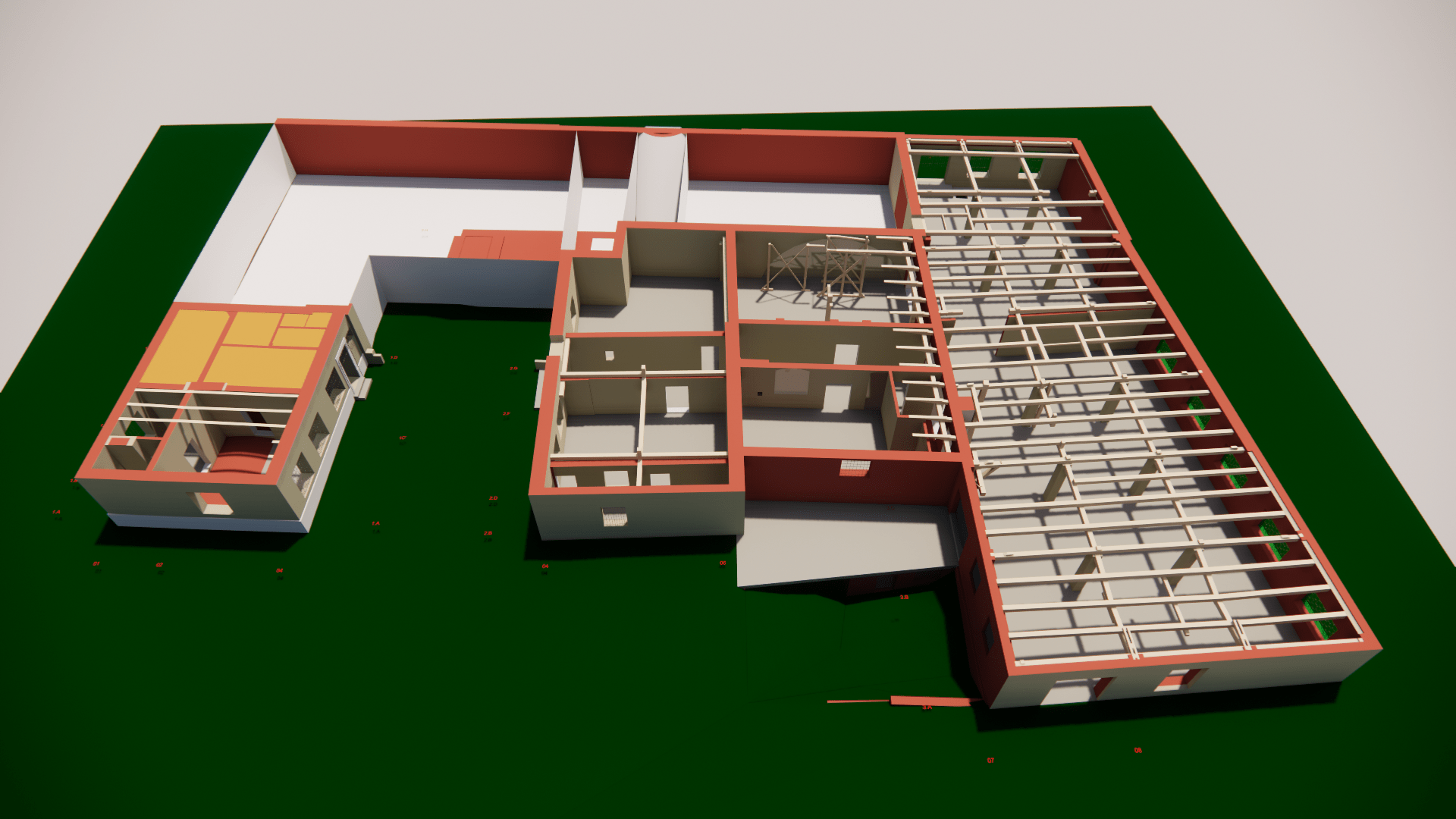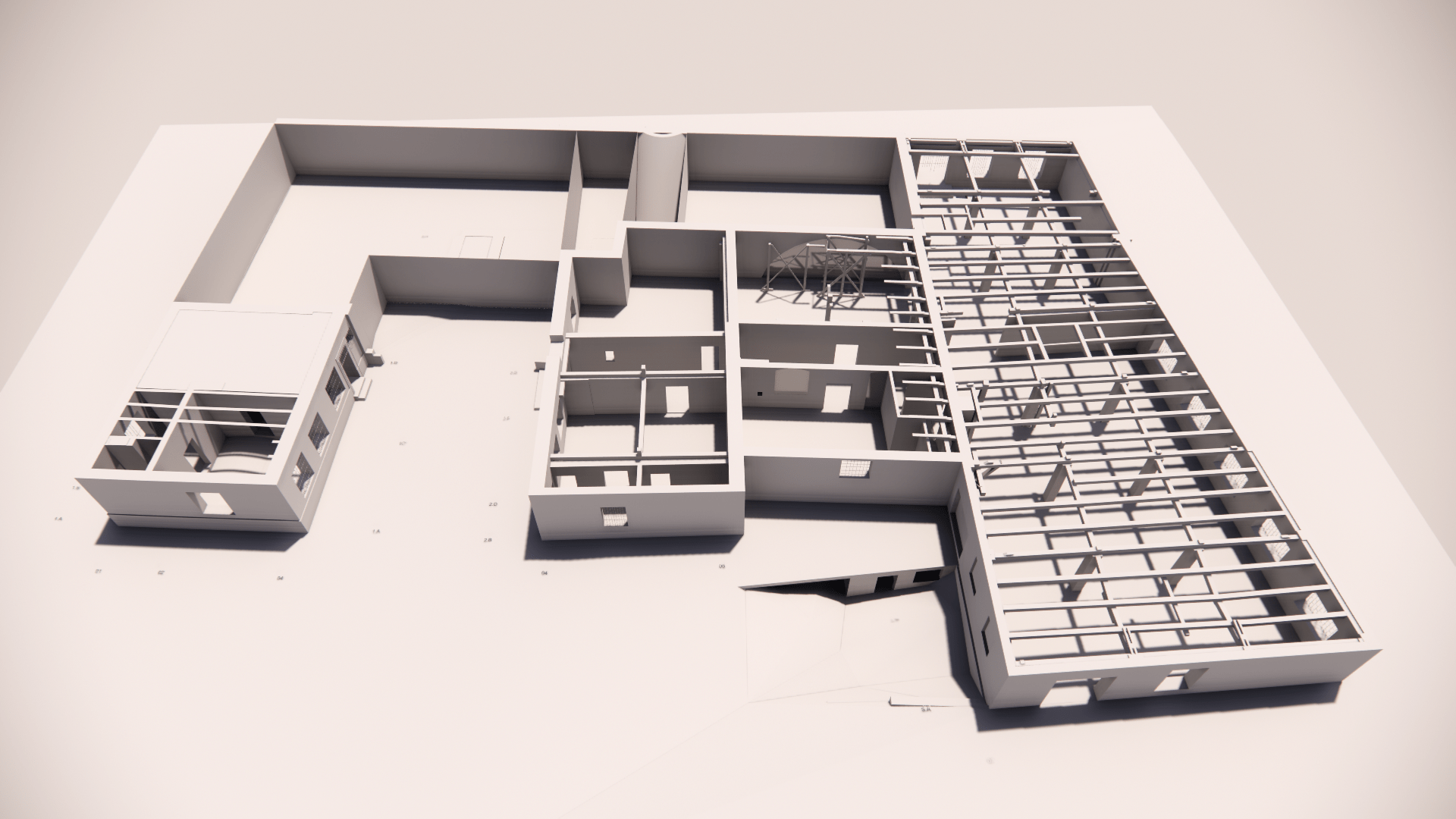 Zebrane przez nas dane w postaci chmur punktów w formacie *.e57 zostały wykorzystane do budowy modelu budynku Archicad. Podczas pomiarów odkryto dodatkowe pomieszczenia, o których istnieniu pierwotnie nie wiedziano. Olbrzymia ilość danych pozwoliła nam precyzyjnie odtworzyć całą konstrukcję budynku.